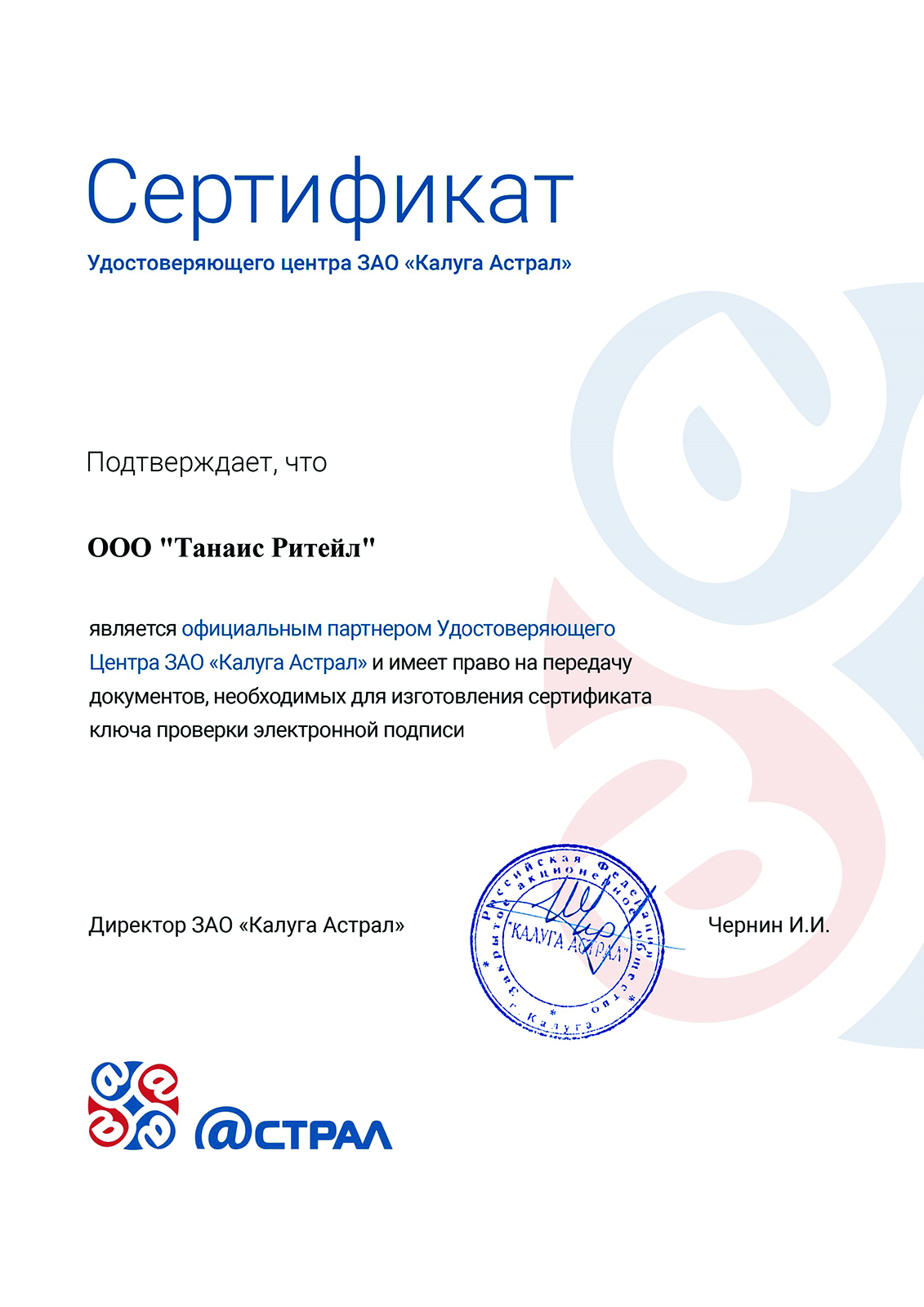 ООО "ТАНАИС Ритейл" является официальным партнером Удостоверяющего Центра ЗАО "Калуга Астрал"