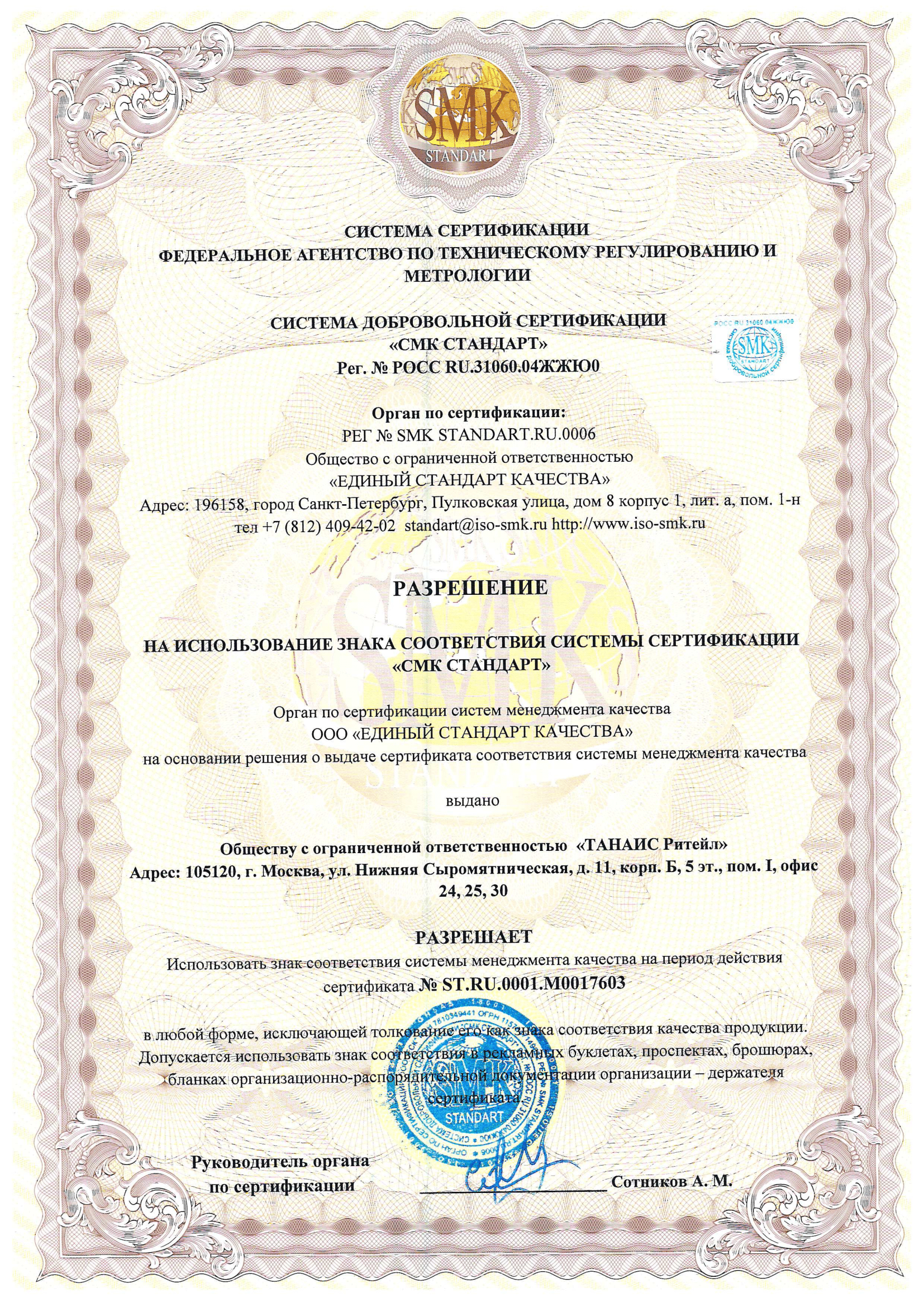 ООО "ТАНАИС Ритейл" Разрешение на использование знака соответствия системы сертификации "СМК СТАНДАРТ"