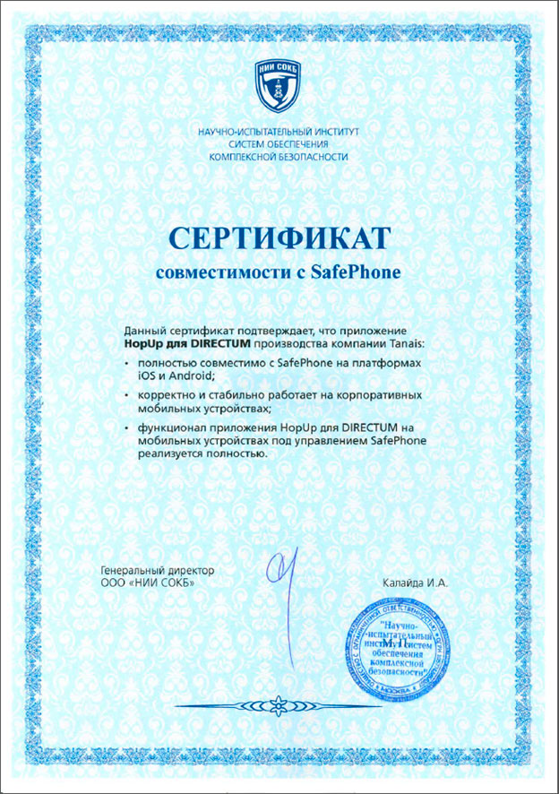 Сертификат совместимости с SafePhone