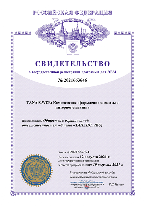 Свидетельство о государственной регистрации программы Комплексное оформление заказа для интернет-магазина