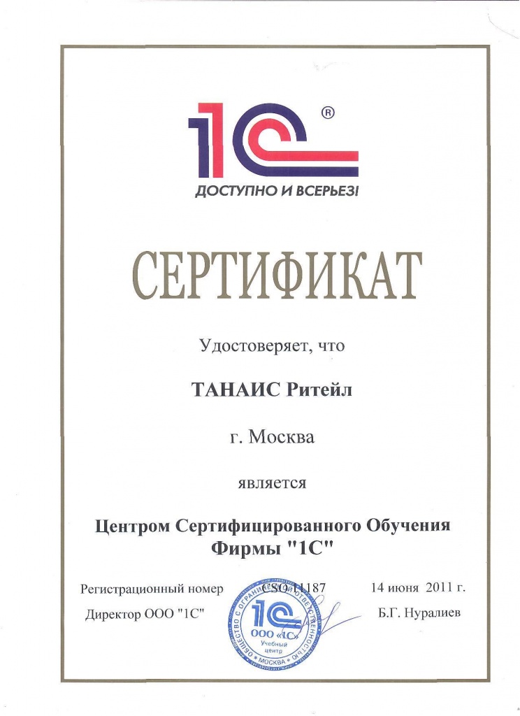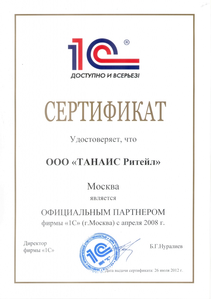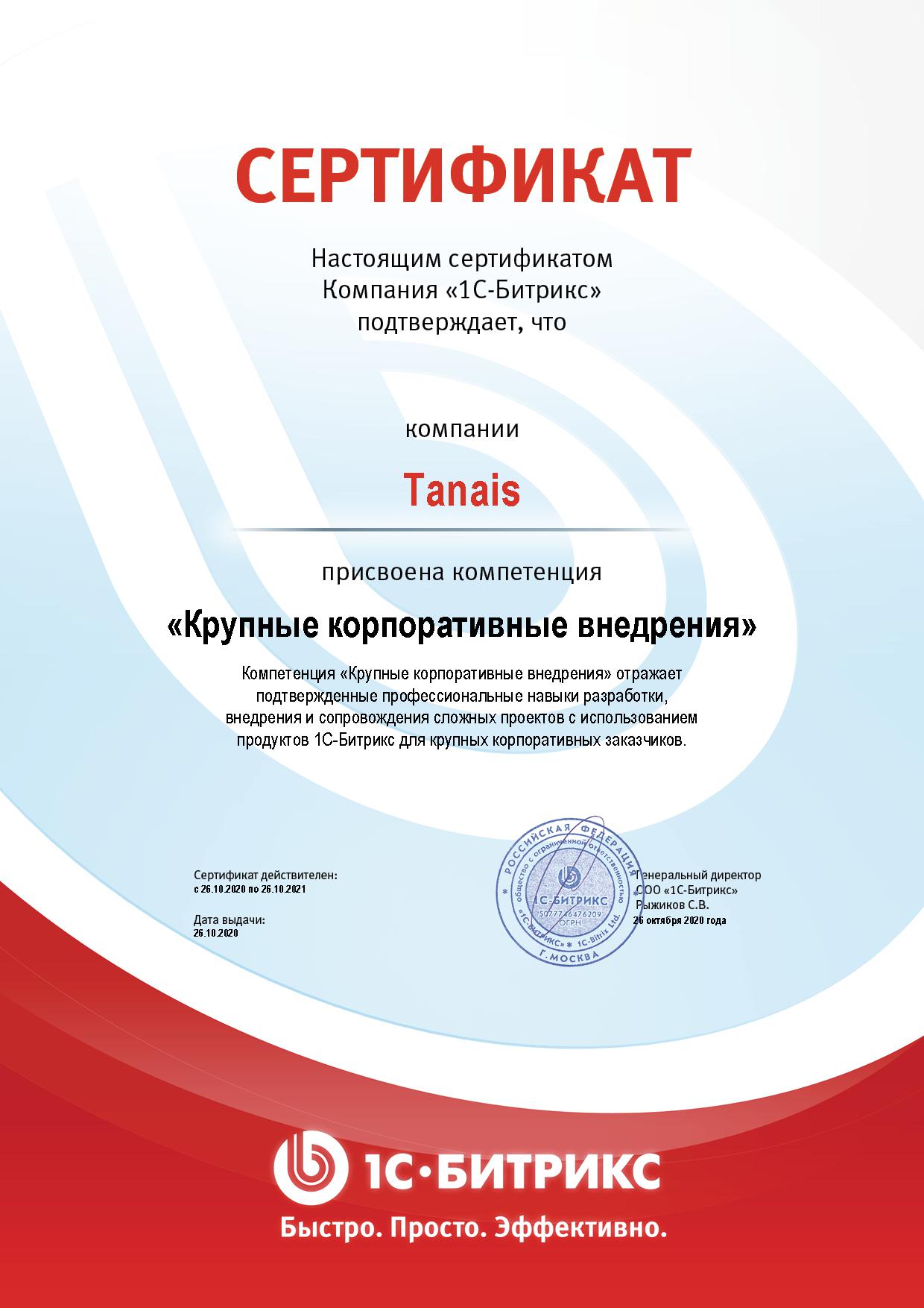 ТАНАИС Ритейл сертификат присвоения компетенции "Крупные корпоративные внедрения"