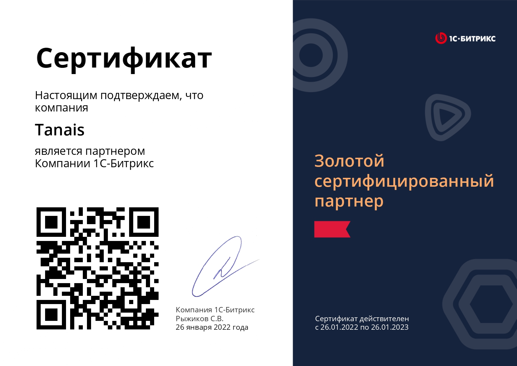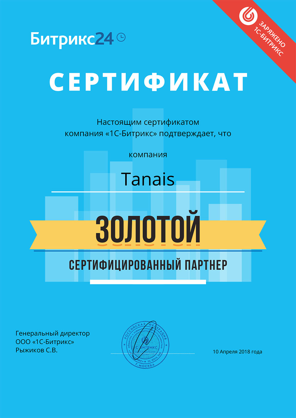 TANAIS золотой сертифицированный партнер 1С-Битрикс