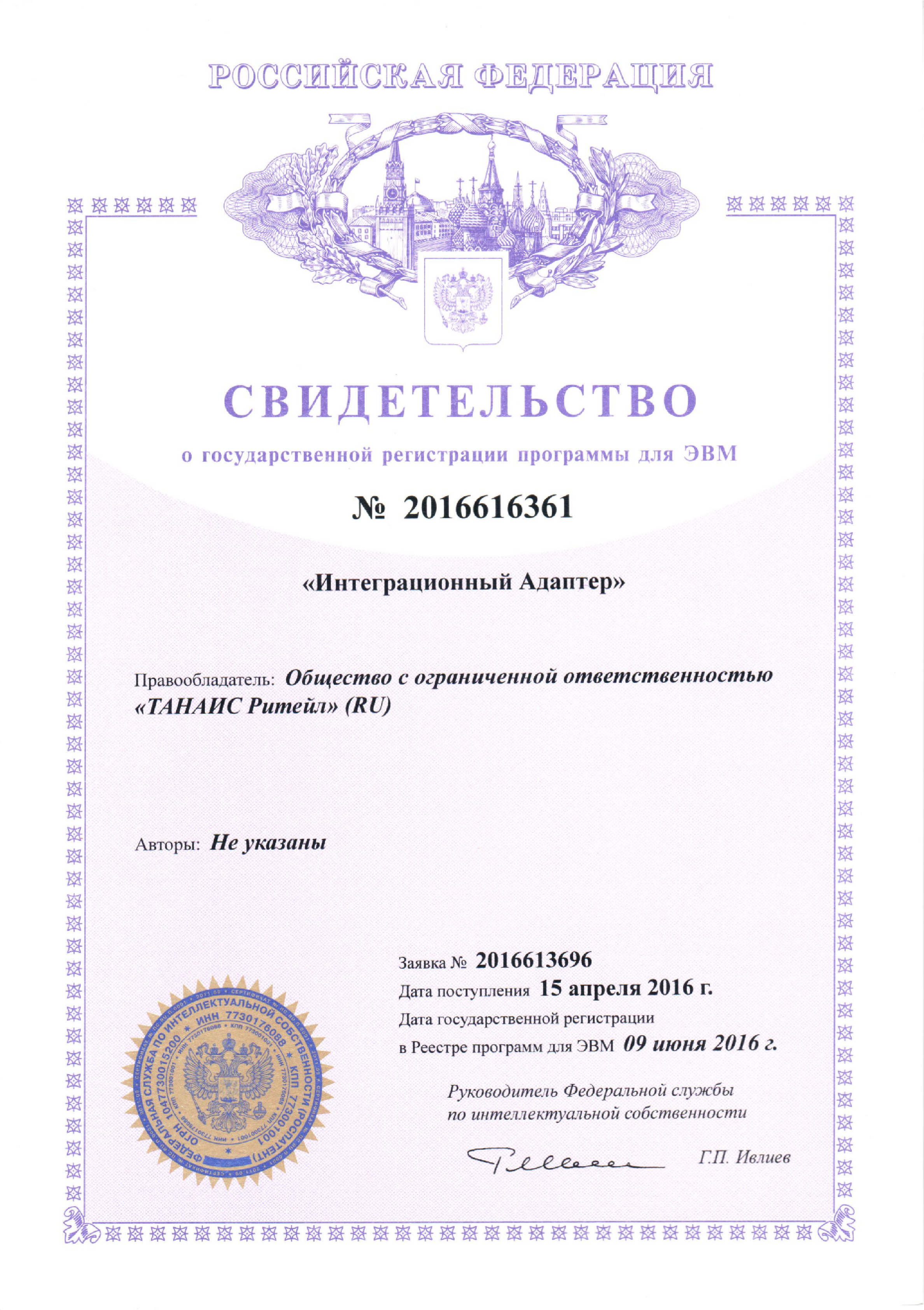 Свидетельство о регистрации решения Интеграционный адаптер