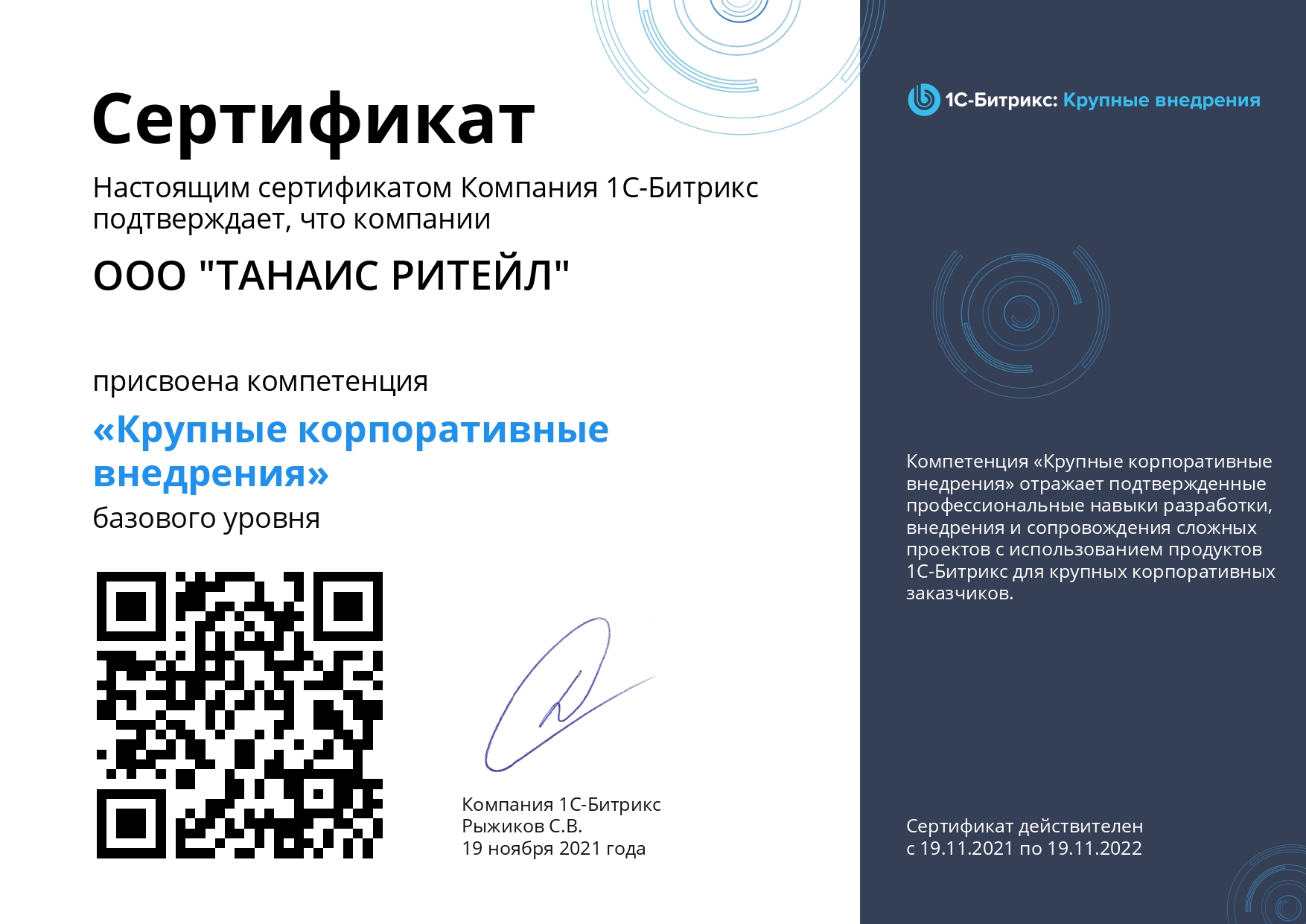Сертификат присвоения компетенции "Крупные корпоративные внедрения"