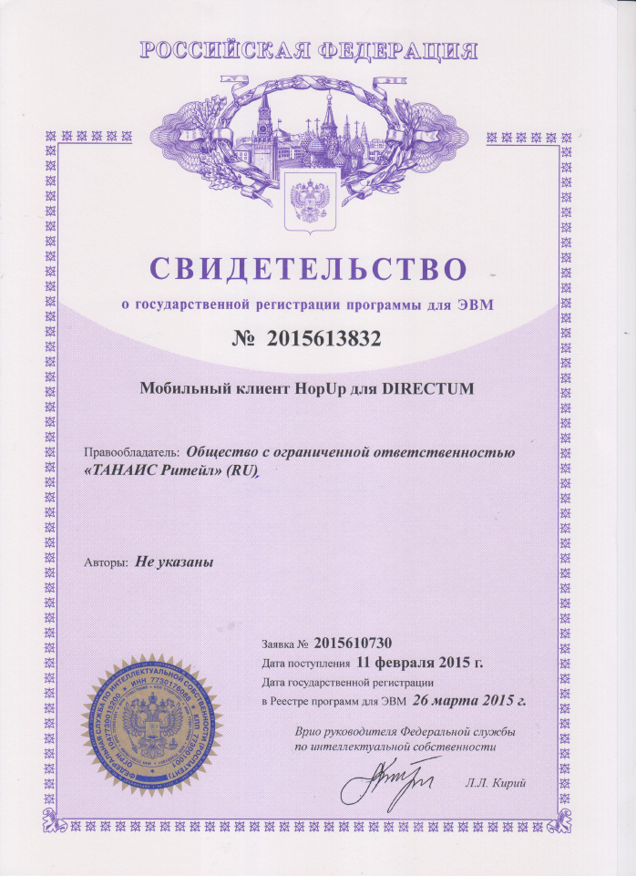 Свидетельство о государственной регистрации программы HopUp для Directum