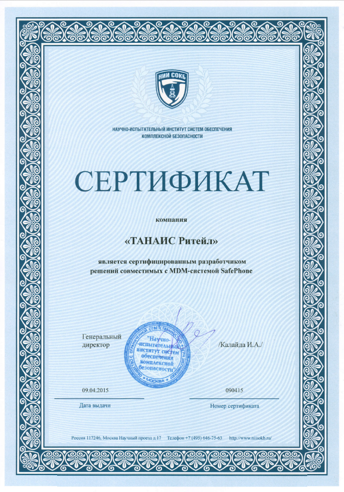 ТАНАИС Ритейл является сертифицированным разработчиком решений совместимых с MDM-системой SafePhone
