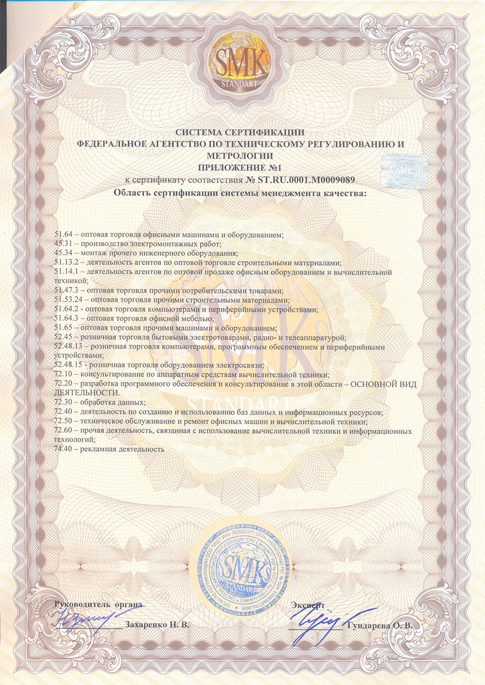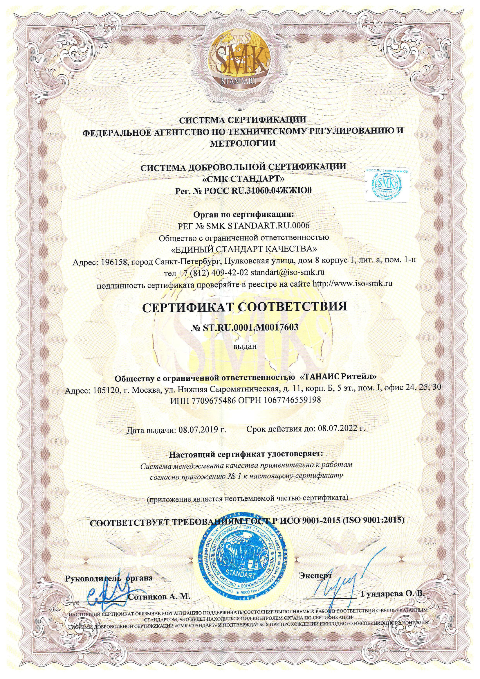 ООО "ТАНАИС Ритейл" Сертификат соответствия системы добровольной сертификации «СМК СТАНДАРТ»